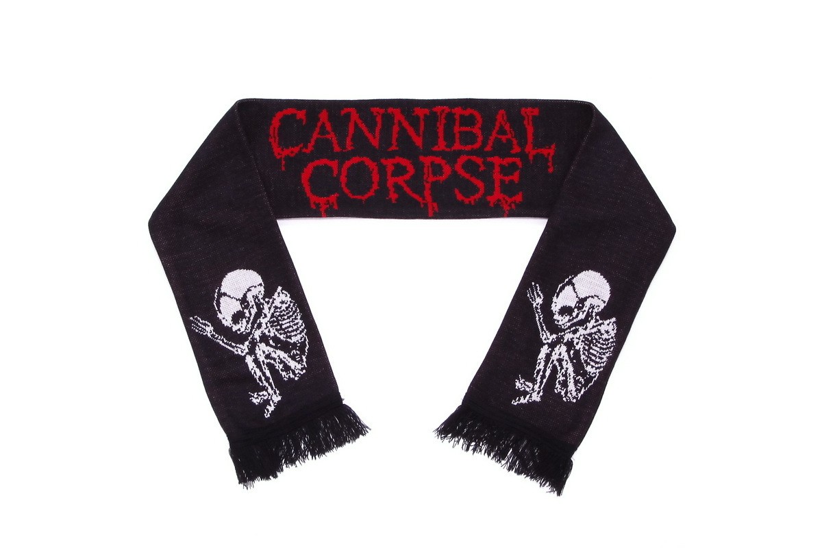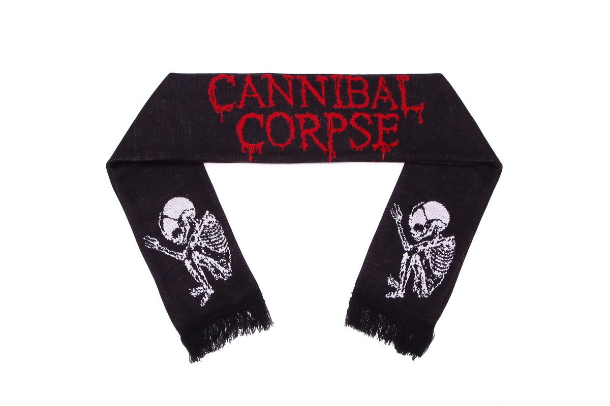 зимний шарф Cannibal Corpse с жаккардовым рисунком и бахромой. Этот шарф изготовлен из высококачественной акриловой пряжи на промышленных вязальных машинах. Он сложен пополам по длине и сшит.