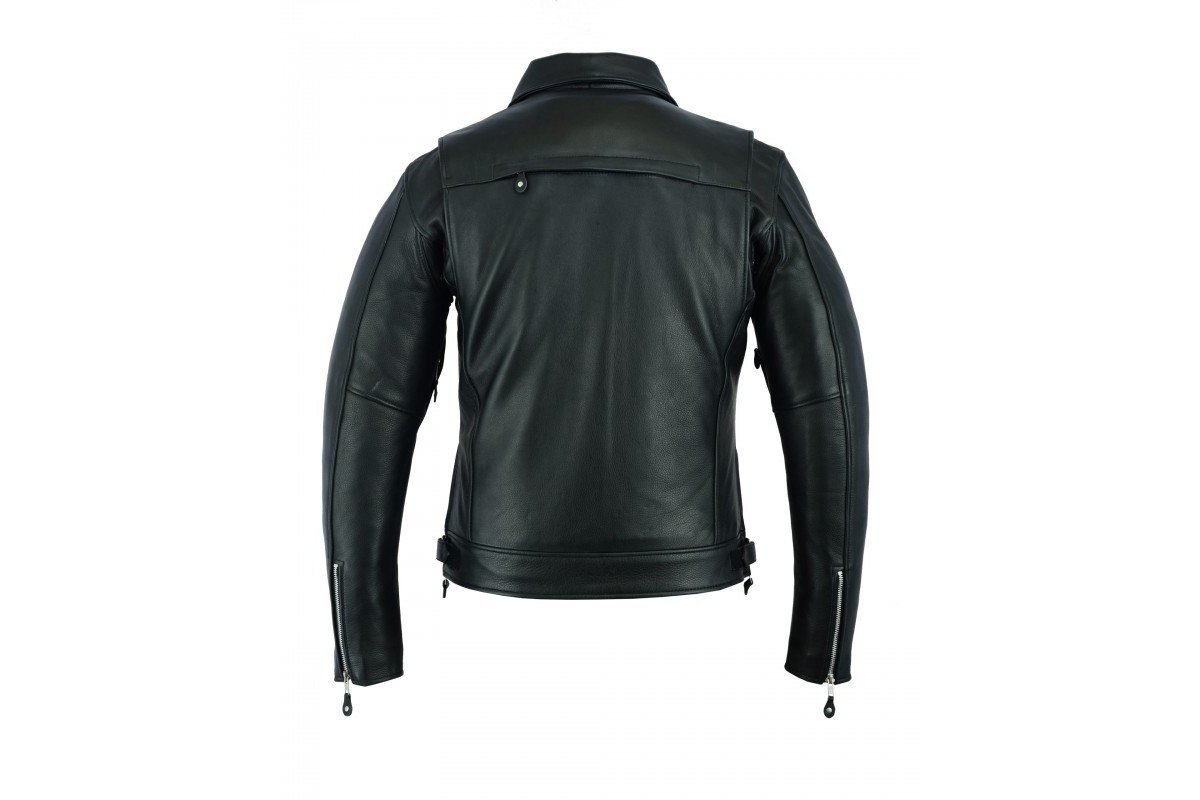 Куртка черного цвета удлиненная с вентиляцией на спине. Прямая молния спереди, два прорезных кармана на молнии, два нагрудных кармана на молнии, вентиляционное отверстия на спине на молнии, боковые утяжки на липучке, подкладка с внутренними карманами, YKK молнии